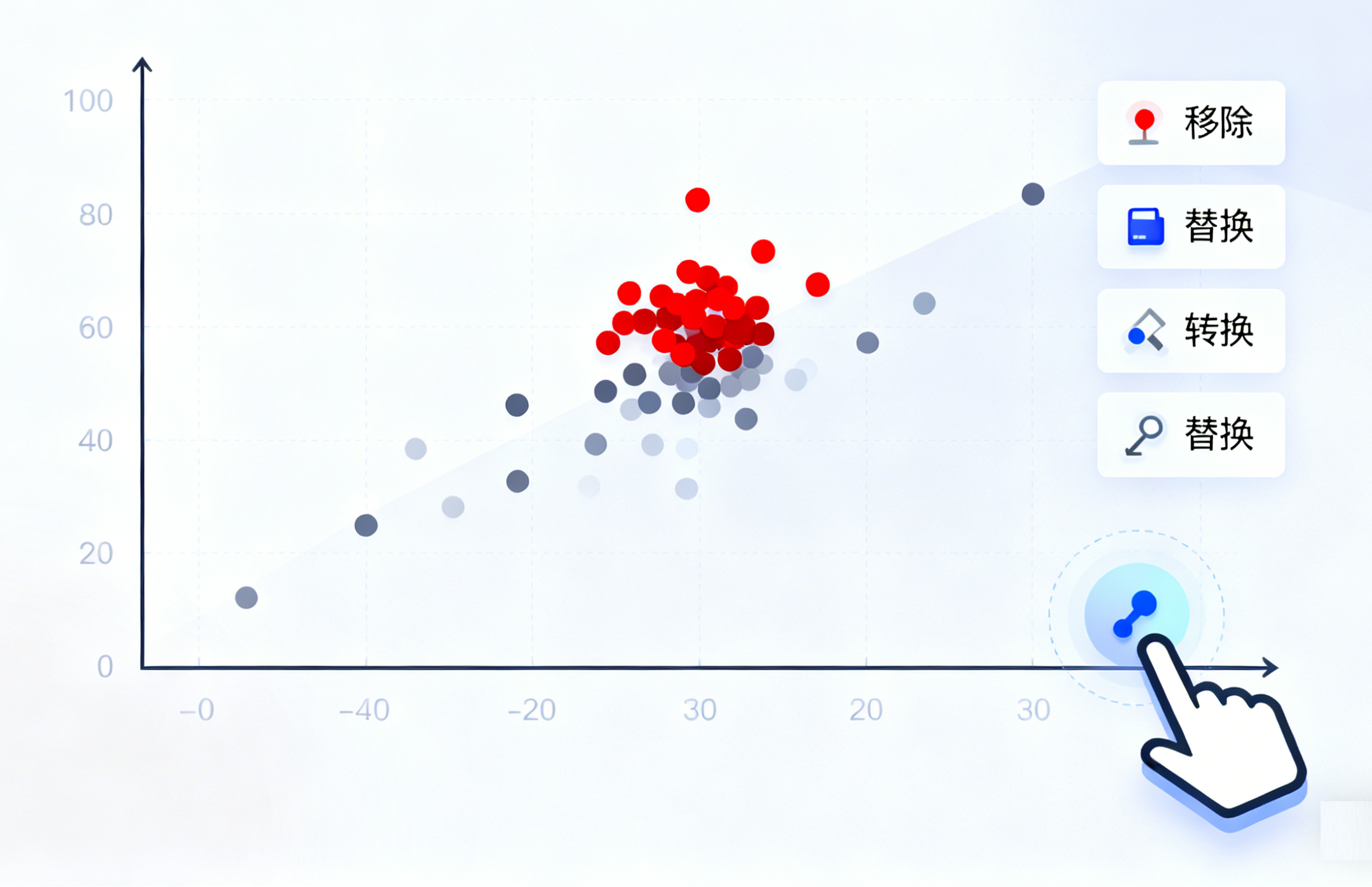 3.替换:用更接近其他数据点的指定值替换异常值,如平均值、中位数等。